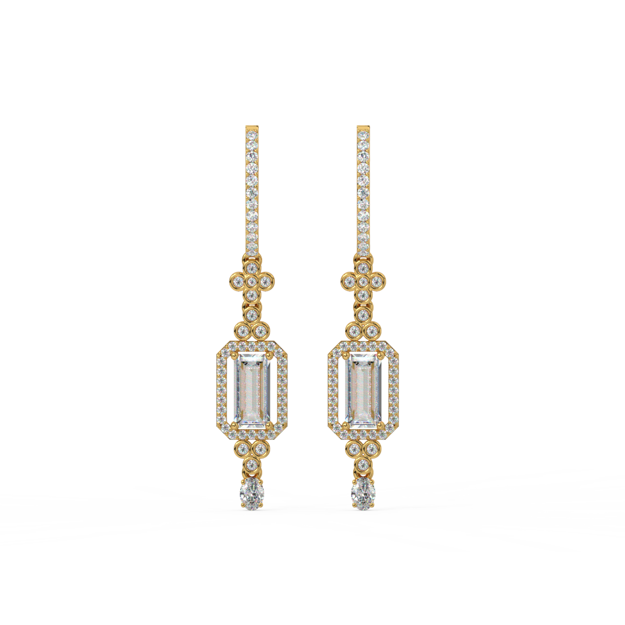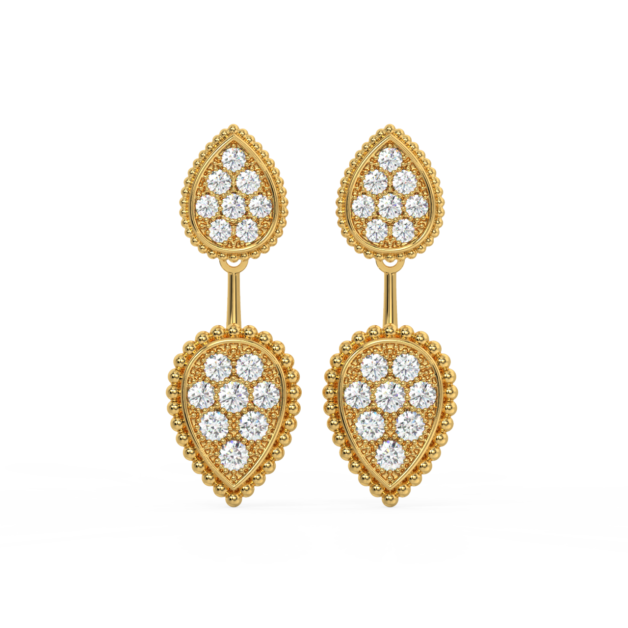 ● Drop Earrings: Drop earrings, also known as dangle earrings, feature a diamond or cluster of diamonds suspended from a stud or hook. They can range from delicate designs with a single diamond to elaborate chandelier earrings with multiple dangling elements, offering sophistication and glamour.
